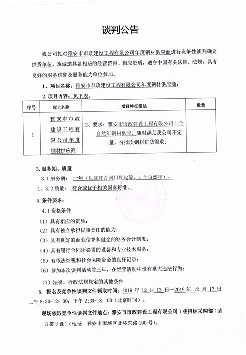 雅安市市政建設(shè)工程有限公司年度鋼材供應(yīng)商競(jìng)爭(zhēng)性談判公告