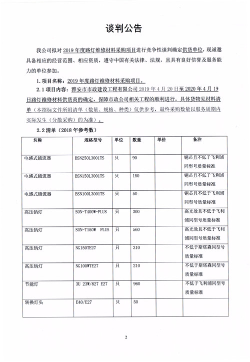 市政公司2019年度路燈維修材料采購項目競爭性談判公告