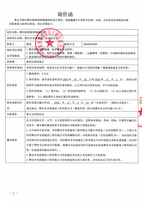 雅安市市政建設工程有限公司雅興橋橋梁伸縮縫詢價函