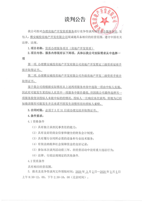 城投地產(chǎn)公司辦理房地產(chǎn)開發(fā)資質(zhì)服務(wù)確認中介服務(wù)單位的競爭性談判公告