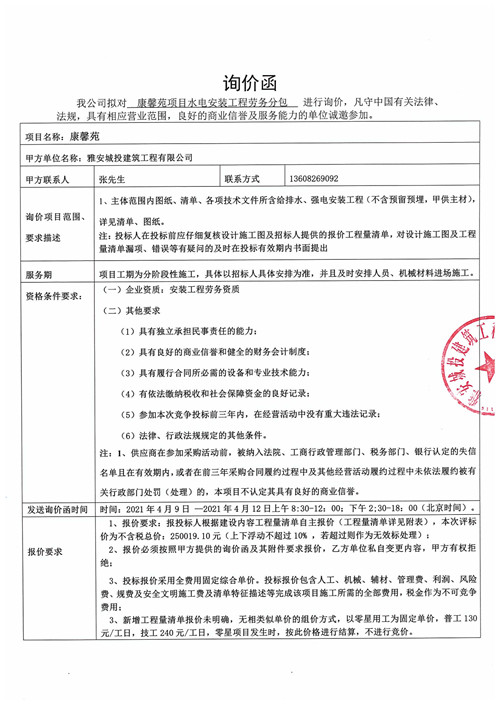 城投建工公司項目水電安裝工程勞務(wù)分包詢價函