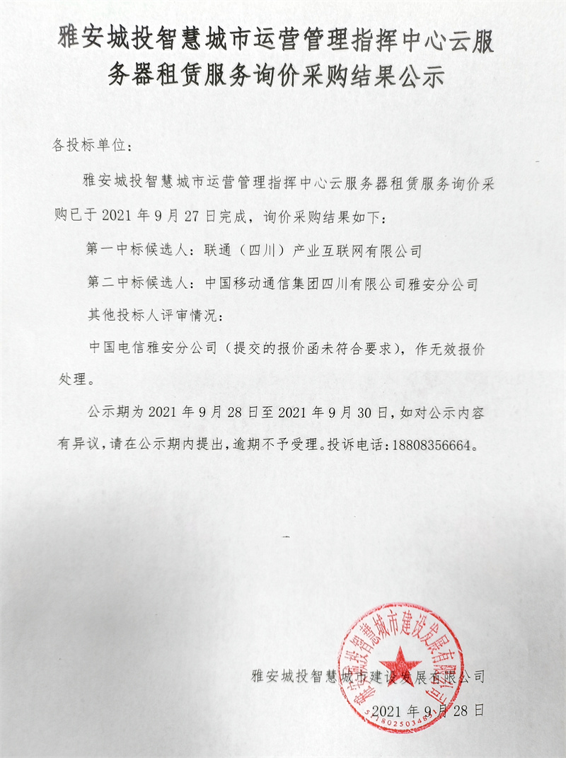 雅安城投智慧城市運營管理指揮中心云服務器租賃服務采購詢價結果公示