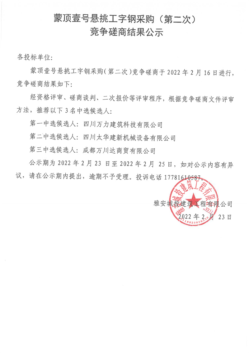蒙頂壹號懸挑工字鋼采購(第二次)競爭磋商結(jié)果公示