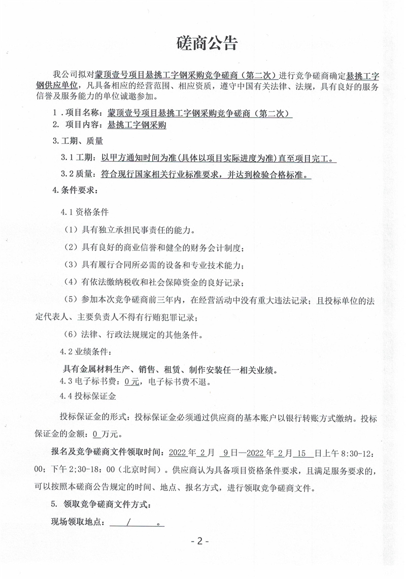 蒙頂壹號項目懸挑工字鋼采購競爭磋商公告(第二次)