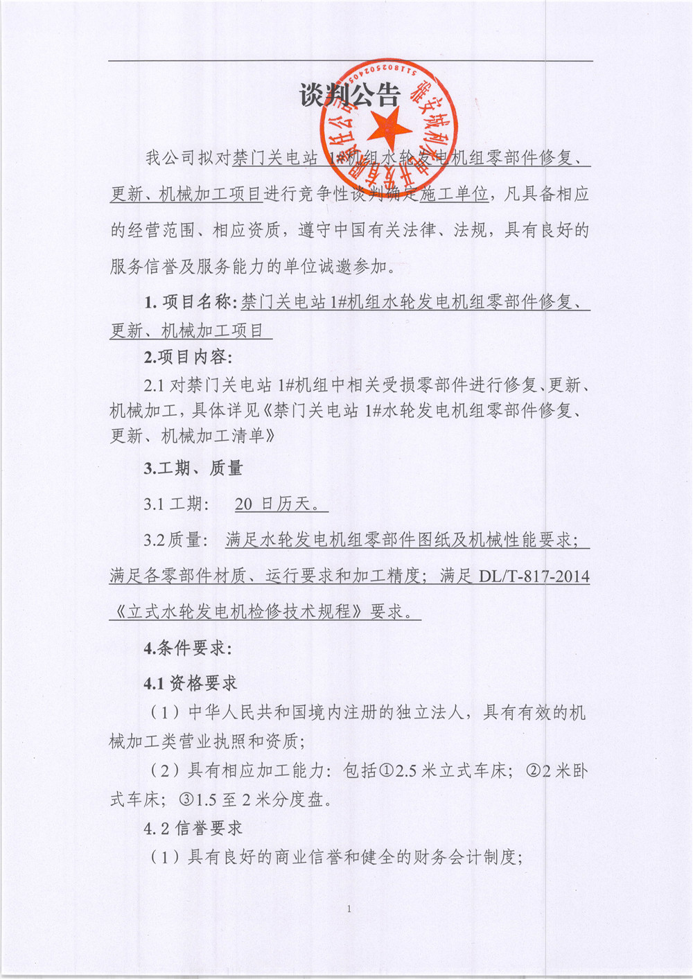 禁門關電站1#機組水輪發(fā)電機組零部件更新、機械加工項目競爭性談判公告