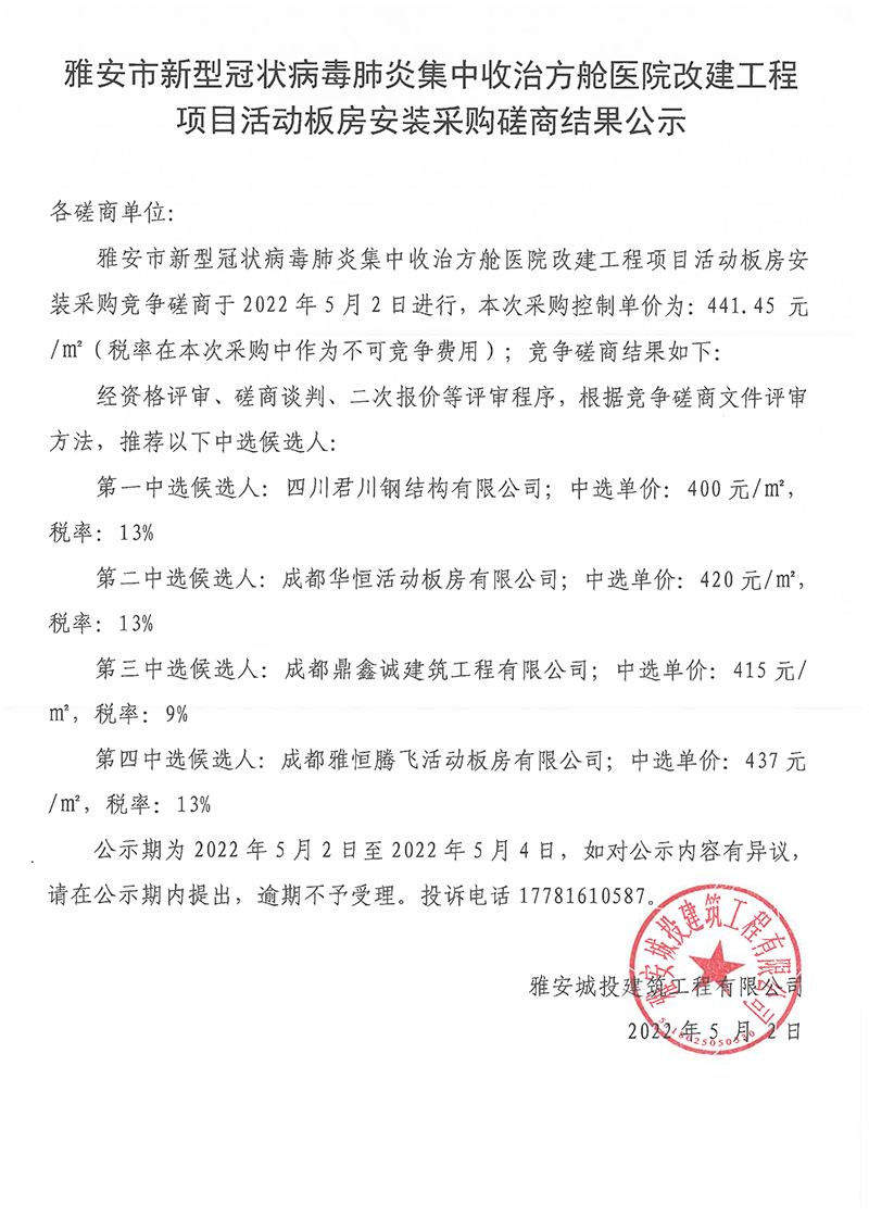 雅安市新型冠狀病毒肺炎集中收治方艙醫(yī)院改建工程項目活動板房安裝采購磋商結(jié)果公示