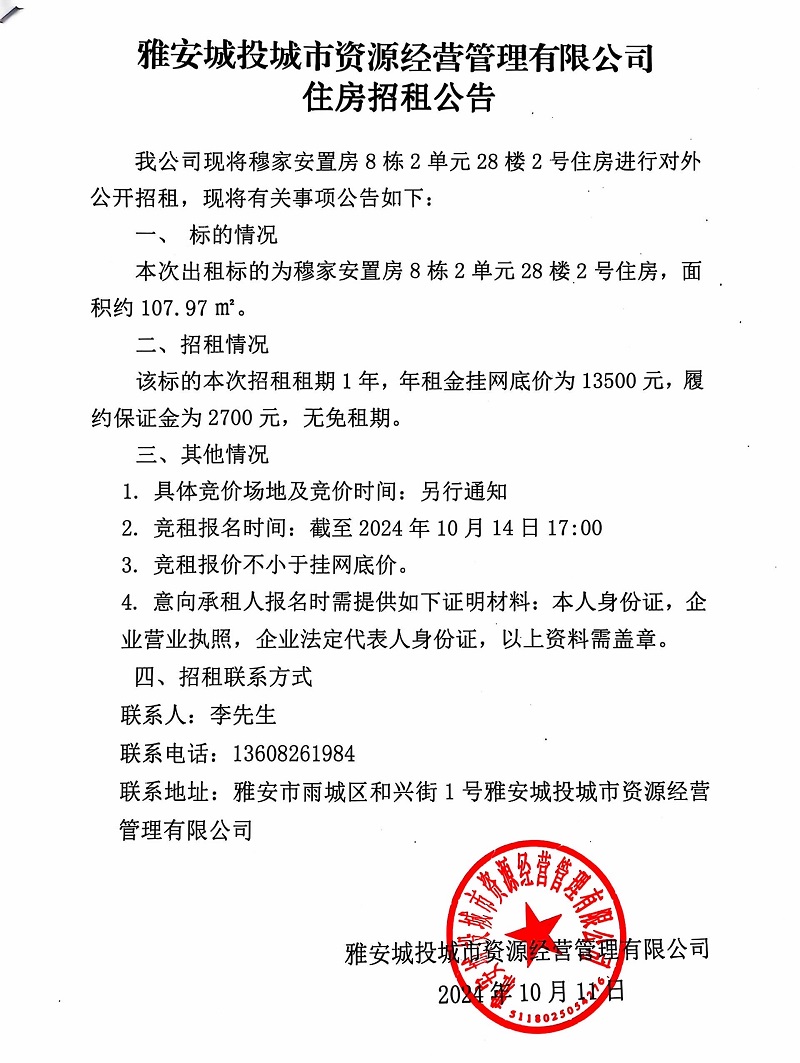 雅安城投城市資源經(jīng)營管理有限公司關(guān)于穆家安置房8棟2單元28樓2號住房招租公告