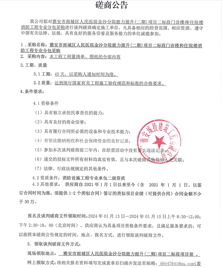 雅安雨城區(qū)人民醫(yī)院金沙分院能力提升(二期)項(xiàng)目二標(biāo)段門診樓和住院樓消防工程專業(yè)分包采購(gòu)談判磋商公告