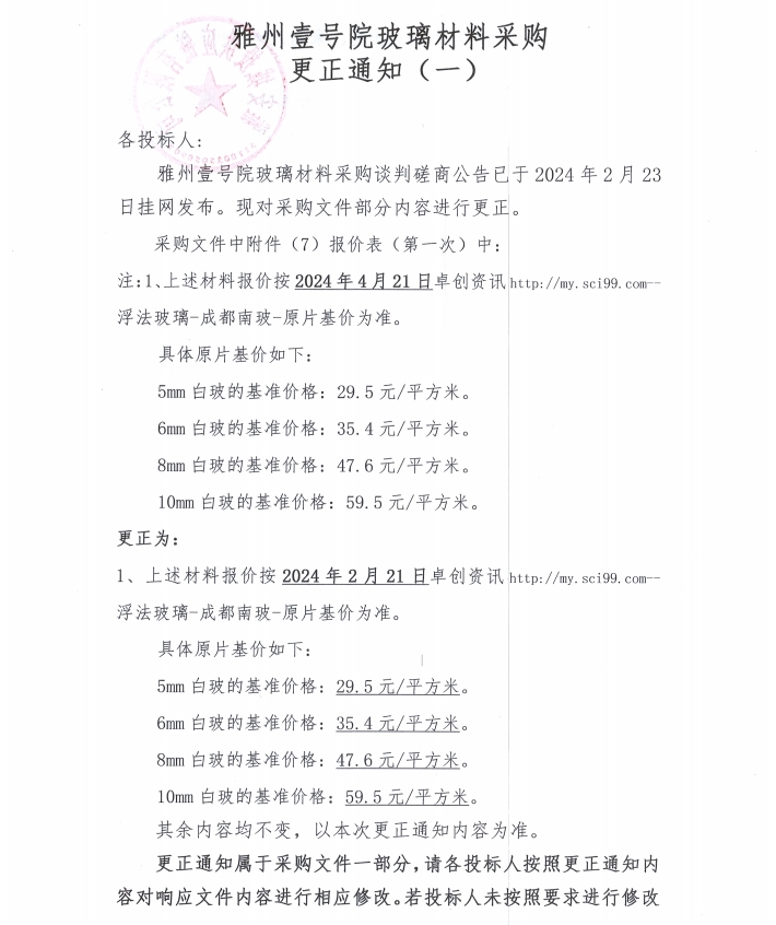 雅州壹號院玻璃材料采購更正通知(一)