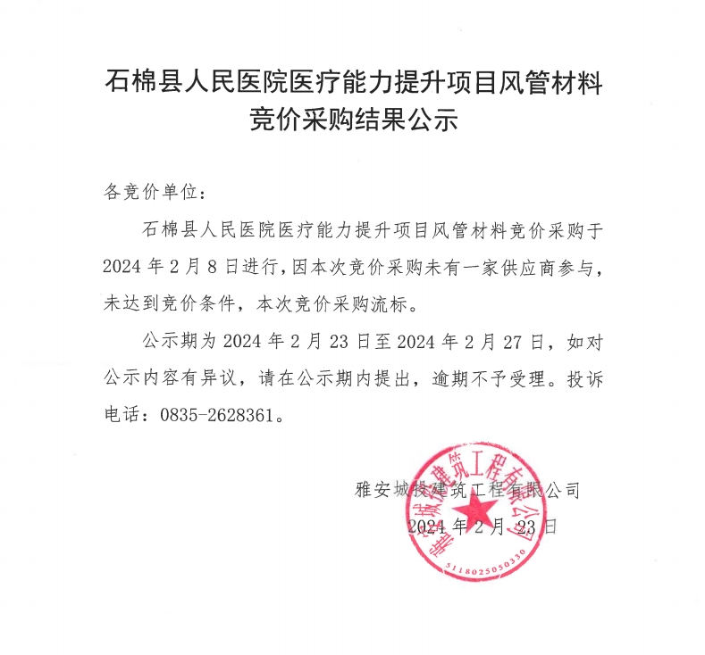 石棉縣人民醫(yī)院醫(yī)療能力提升項(xiàng)目風(fēng)管材料競價(jià)采購結(jié)果公示