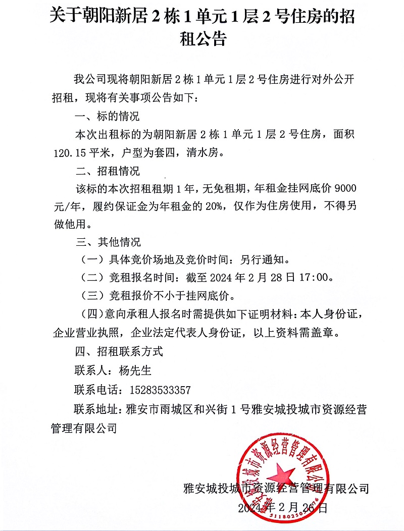 關于朝陽新居2棟1單元1層2號住房的招租公告