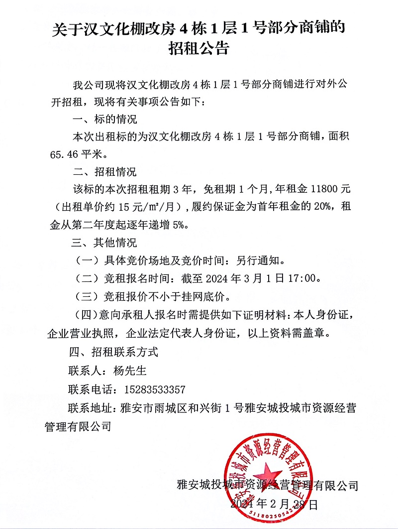關(guān)于漢文化棚改房4棟1層1號部分商鋪的招租公告