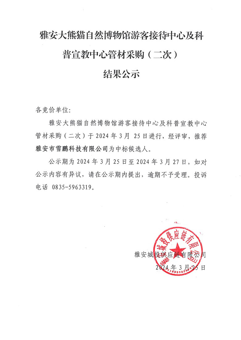 雅安大熊貓自然博物館游客接待中心及科普宣教中心管材采購(gòu)(二次)結(jié)果公示