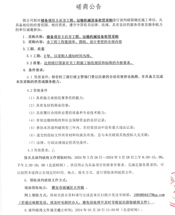儲備項目土石方工程、運輸機械設(shè)備租賃采購磋商公告