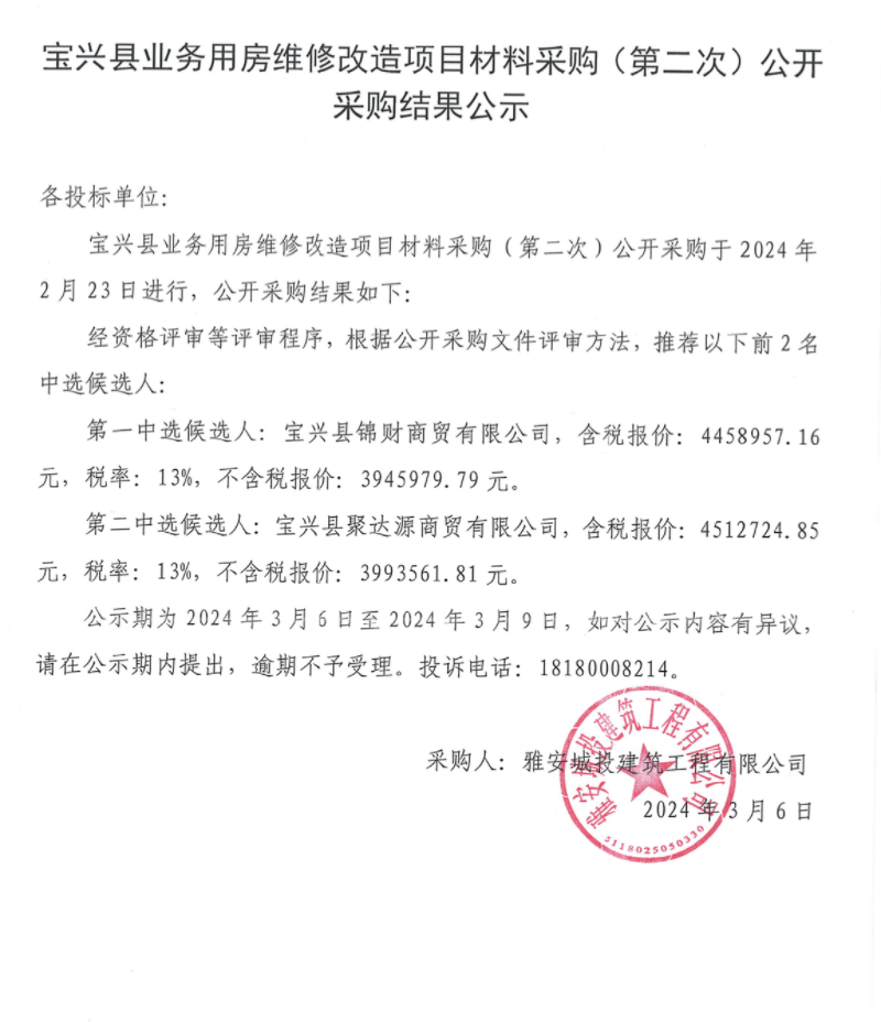 寶興縣業(yè)務用房維修改造項目材料采購(第二次)公開采購結果公示