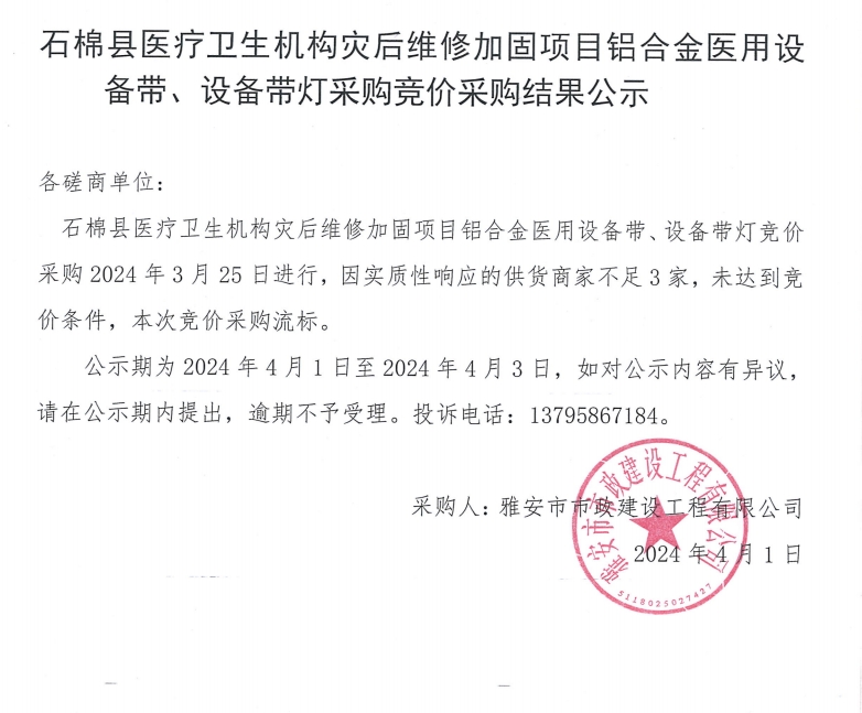 石棉縣醫(yī)療衛(wèi)生機(jī)構(gòu)災(zāi)后維修加固項(xiàng)目鋁合金醫(yī)用設(shè)備帶、設(shè)備帶燈采購(gòu)競(jìng)價(jià)采購(gòu)結(jié)果公示