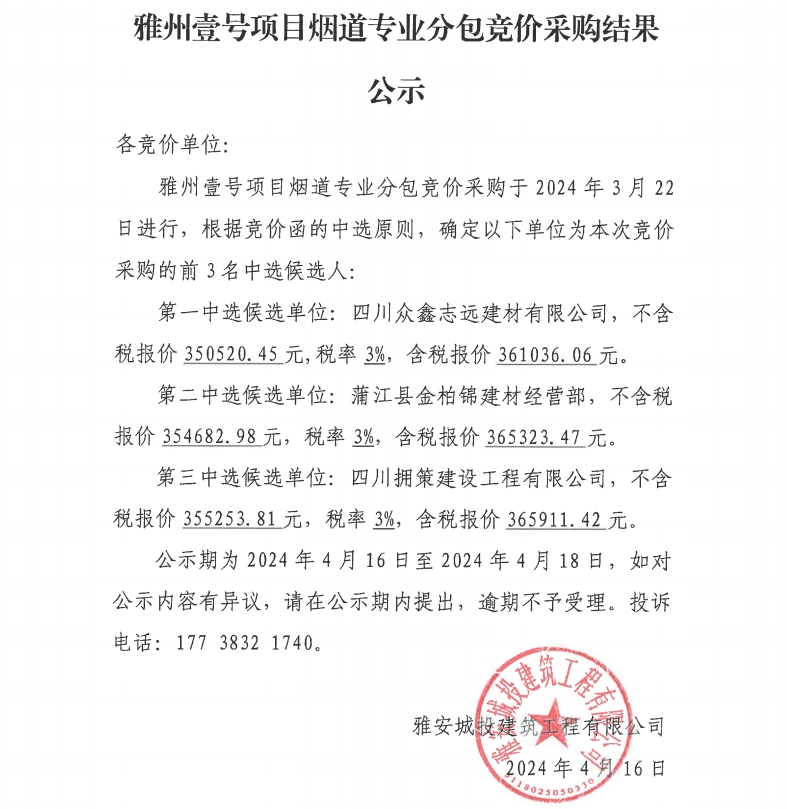 雅州壹號項目煙道專業(yè)分包競價采購結(jié)果公示
