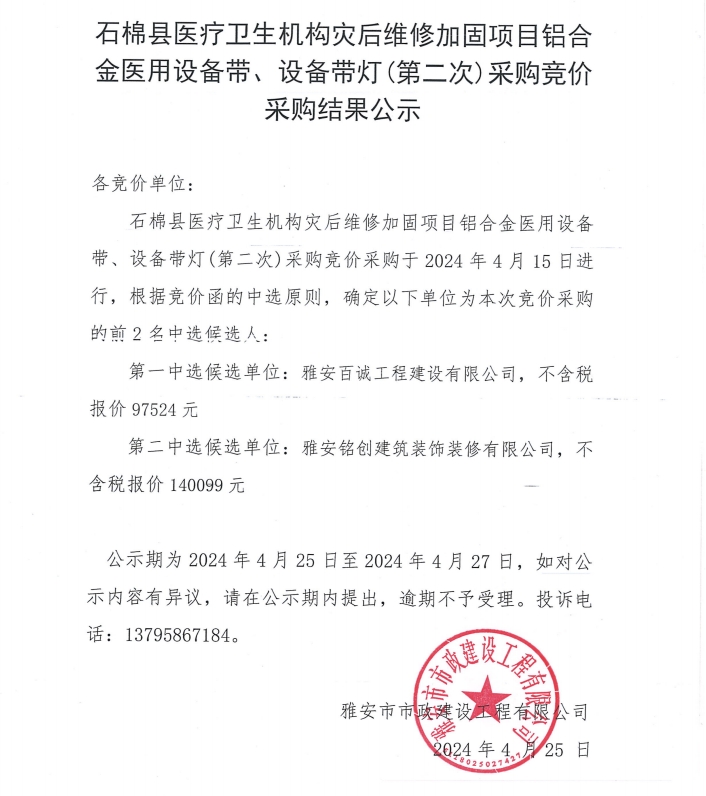 石棉縣醫(yī)療衛(wèi)生機(jī)構(gòu)災(zāi)后加固改造項(xiàng)目鋁合金醫(yī)用設(shè)備帶、設(shè)備帶燈(第二次)采購競價采購結(jié)果公示