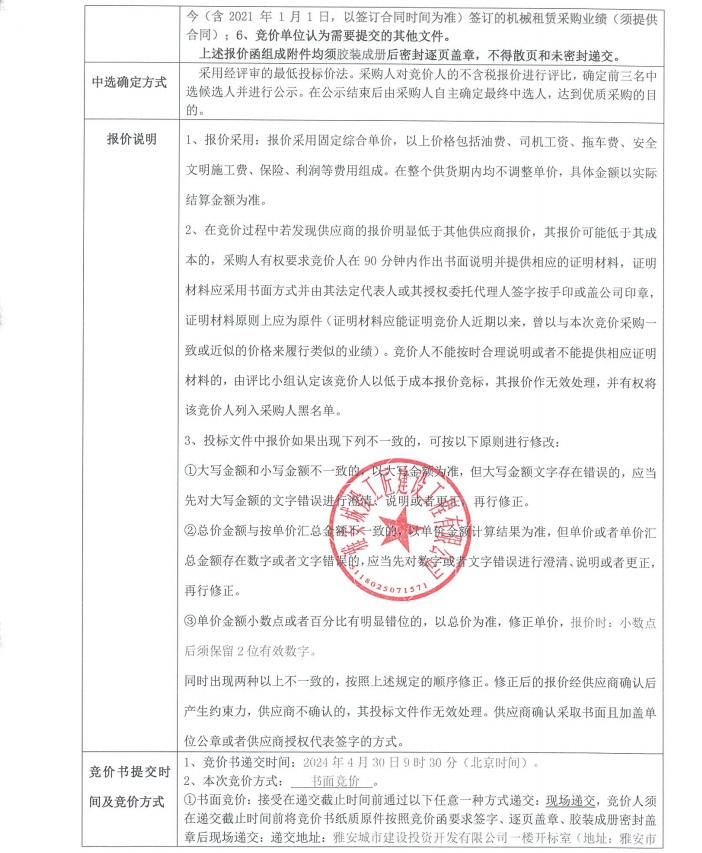 雅州壹號院總坪項目(樣板段)機械租賃采購競價公告