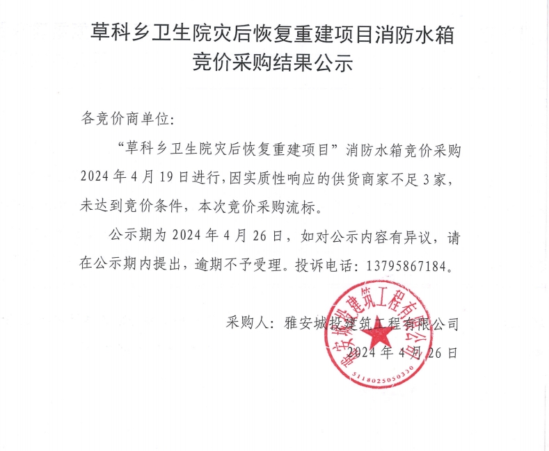 草科鄉(xiāng)衛(wèi)生院災(zāi)后恢復(fù)重建項(xiàng)目消防水箱競(jìng)價(jià)采購結(jié)果公示
