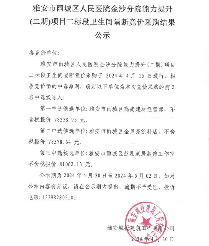 雅安市雨城區(qū)人民醫(yī)院金沙分院能力提升(二期)項(xiàng)目二標(biāo)段衛(wèi)生間隔斷競(jìng)價(jià)采購(gòu)結(jié)果公示