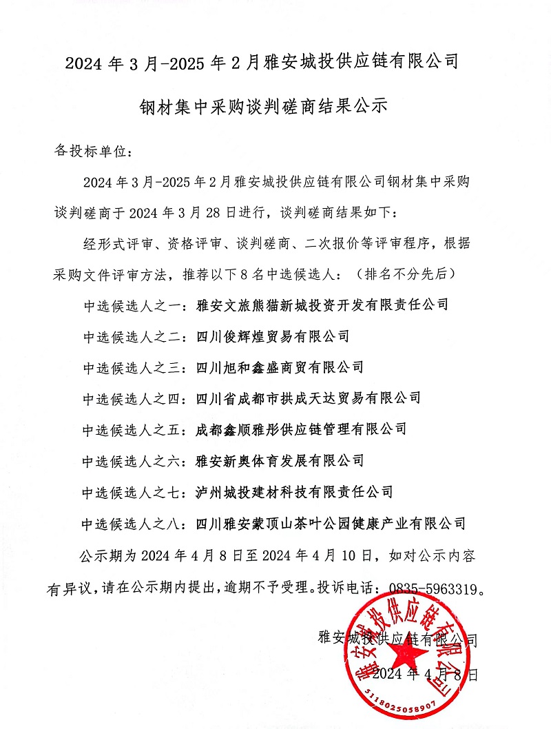 2024年3月-2025年2月雅安城投供應鏈有限公司鋼材集中采購談判磋商結果公示