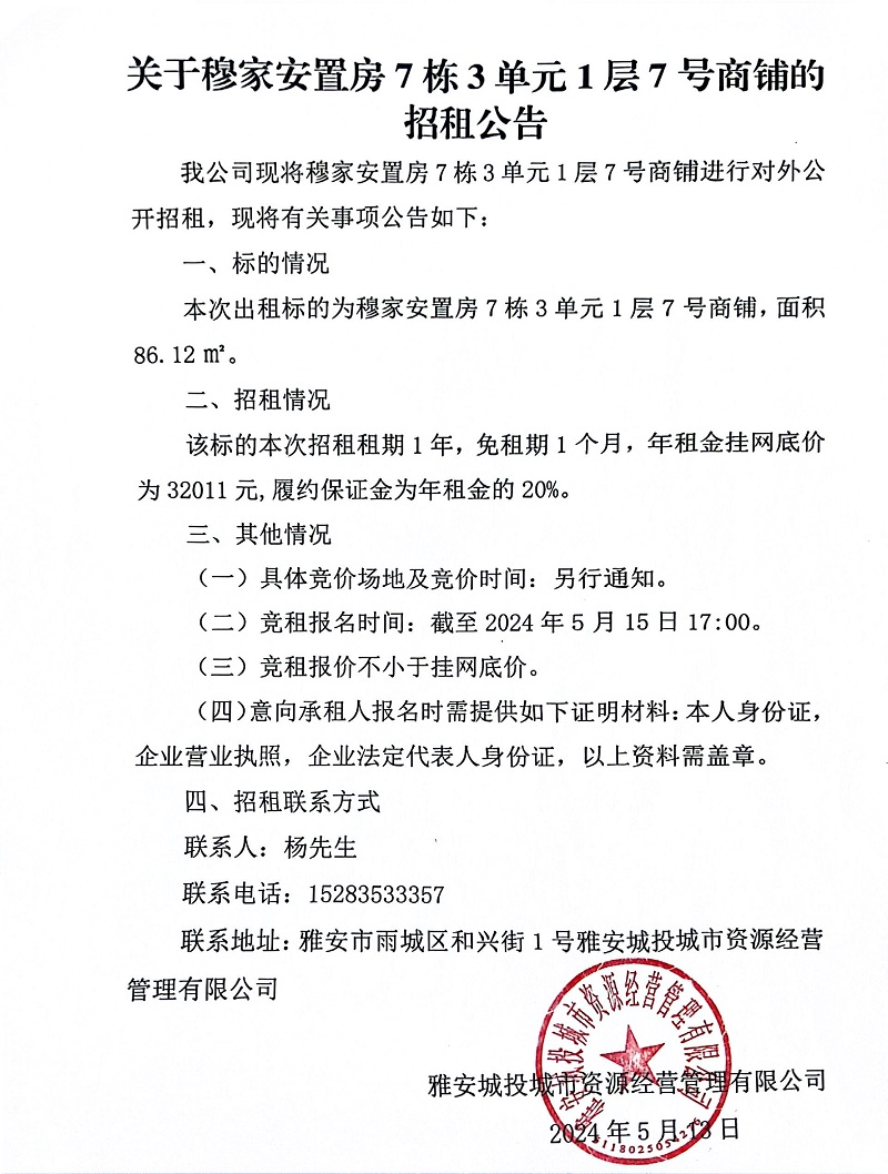 關(guān)于穆家安置房7棟3單元1層7號(hào)商鋪的招租公告