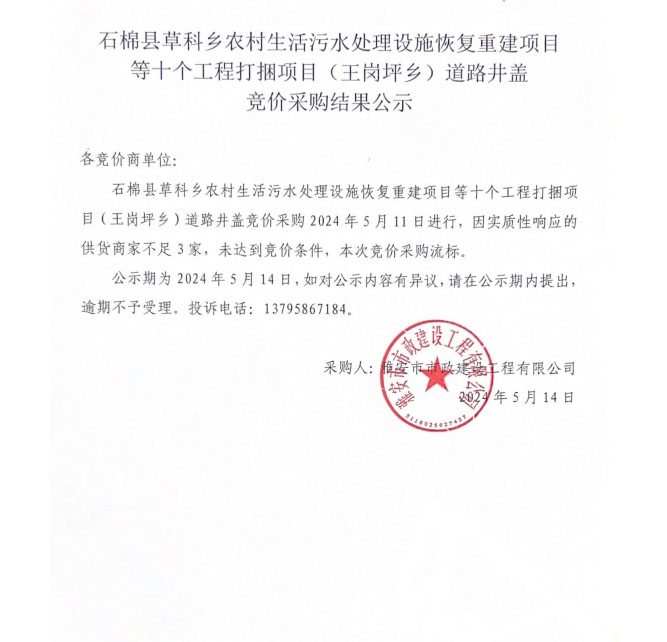 石棉縣草科鄉(xiāng)農村生活污水處理設施恢復重建項目等十個工程打捆項目(王崗坪鄉(xiāng))道路井蓋競價采購結果公示