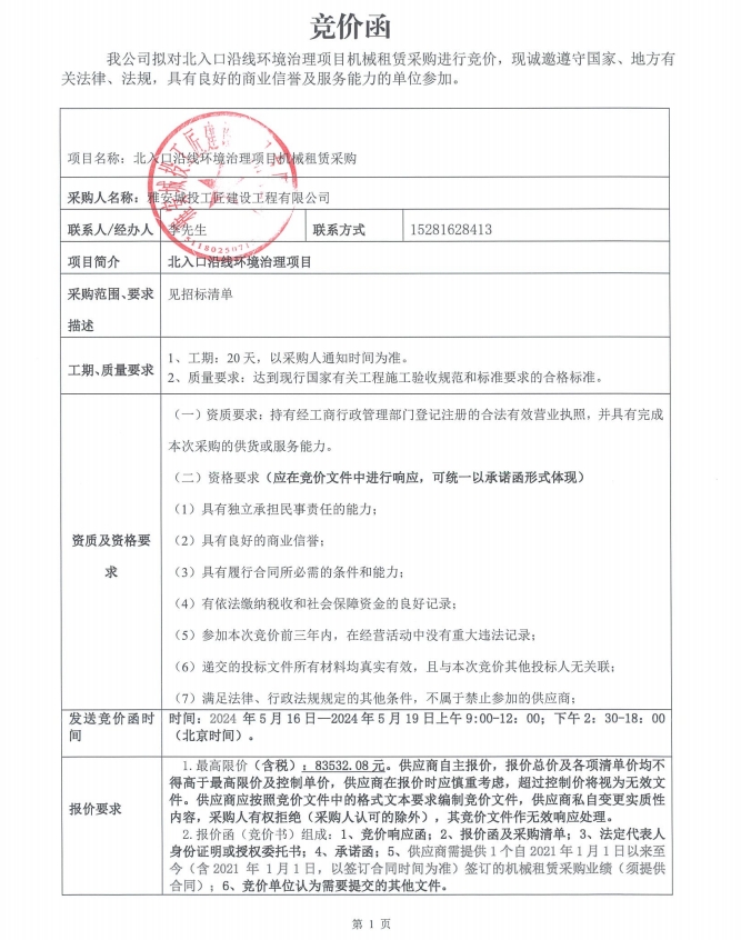 北入口沿線環(huán)境治理項目機械租賃采購競價公告