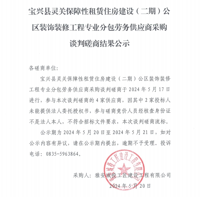 寶興縣靈關(guān)保障性租賃住房建設(shè)(二期)公區(qū)裝飾裝修工程專業(yè)分包勞務(wù)供應(yīng)商采購談判磋商結(jié)果公示