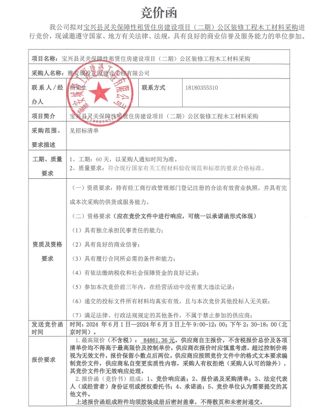 寶興縣靈關(guān)保障性租賃住房建設(shè)項(xiàng)目(二期)公區(qū)裝修工程木工材料采購競價公告