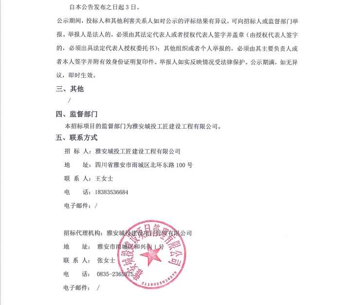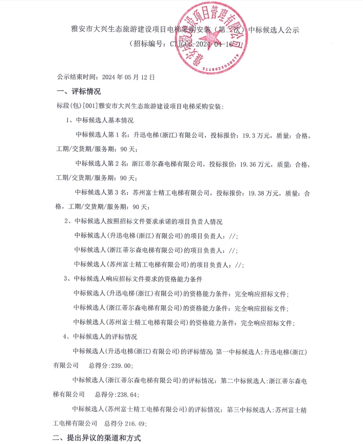雅安市大興生態(tài)旅游建設(shè)項(xiàng)目電梯采購安裝(第二次)中標(biāo)候選人公示
