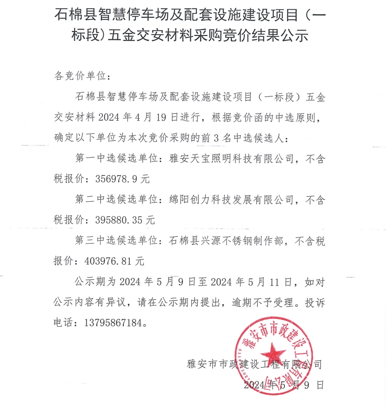 石棉縣智慧停車場及配套設施建設項目(一標段)五金交安材料采購競價結(jié)果公示