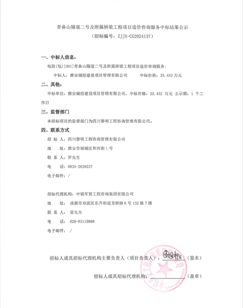 青鼻山隧道二號(hào)及附屬橋梁工程項(xiàng)目造價(jià)咨詢服務(wù)中標(biāo)結(jié)果公示