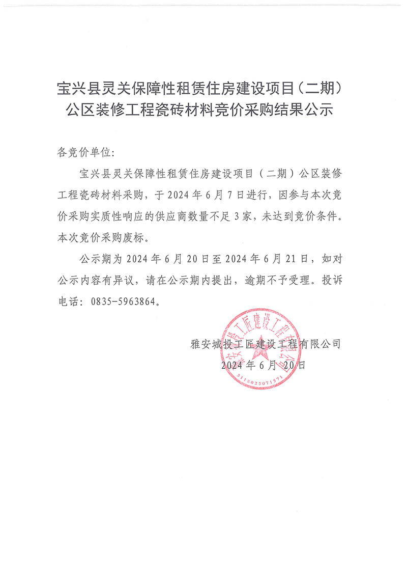 寶興縣靈關(guān)保障性租賃住房建設(shè)項目(二期)公區(qū)裝修工程瓷磚材料競價采購結(jié)果公示