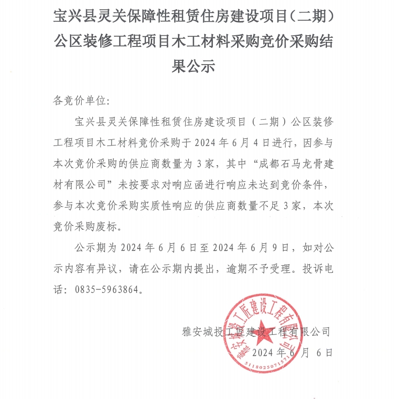 寶興縣靈關(guān)保障性租賃住房建設(shè)項(xiàng)目(二期)公區(qū)裝修工程項(xiàng)目木工材料采購(gòu)競(jìng)價(jià)采購(gòu)結(jié)果公示