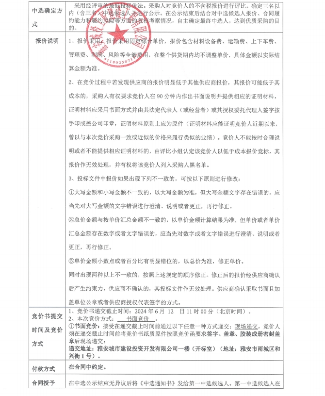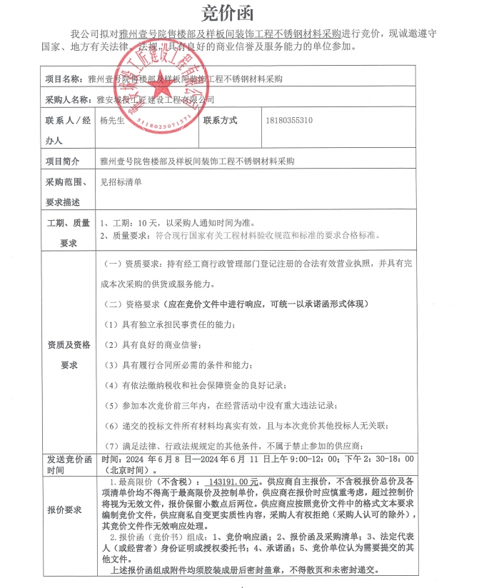 競價函-不銹鋼采購-雅州壹號院售樓部及樣板間