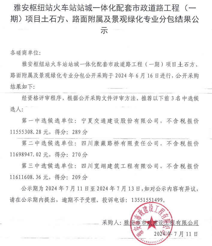 雅安樞紐站火車站站城一體化配套市政道路工程(一期)項目土石方、路面附屬及景觀綠化專業(yè)分包結(jié)果公示