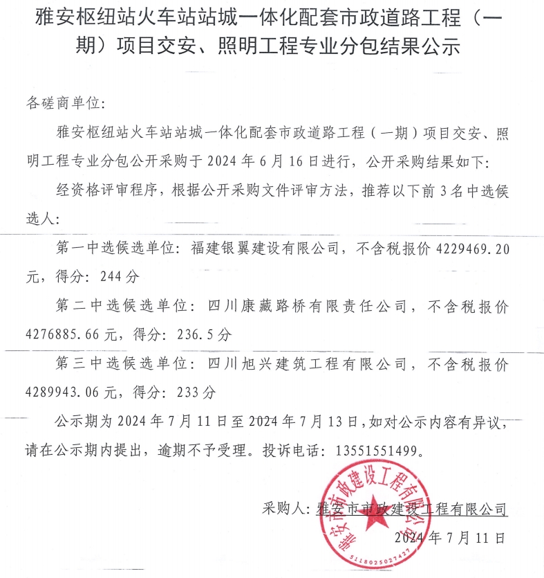 雅安樞紐站火車(chē)站站城一體化配套市政道路工程(一期)項(xiàng)目交安、照明工程專業(yè)分包結(jié)果公示