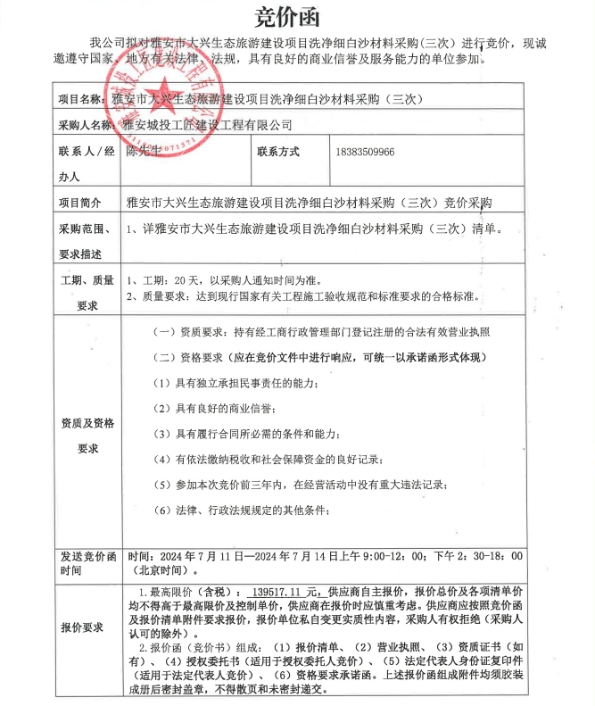 雅安市大興生態(tài)旅游建設(shè)項目洗凈細白沙材料采購(三次)競價公告