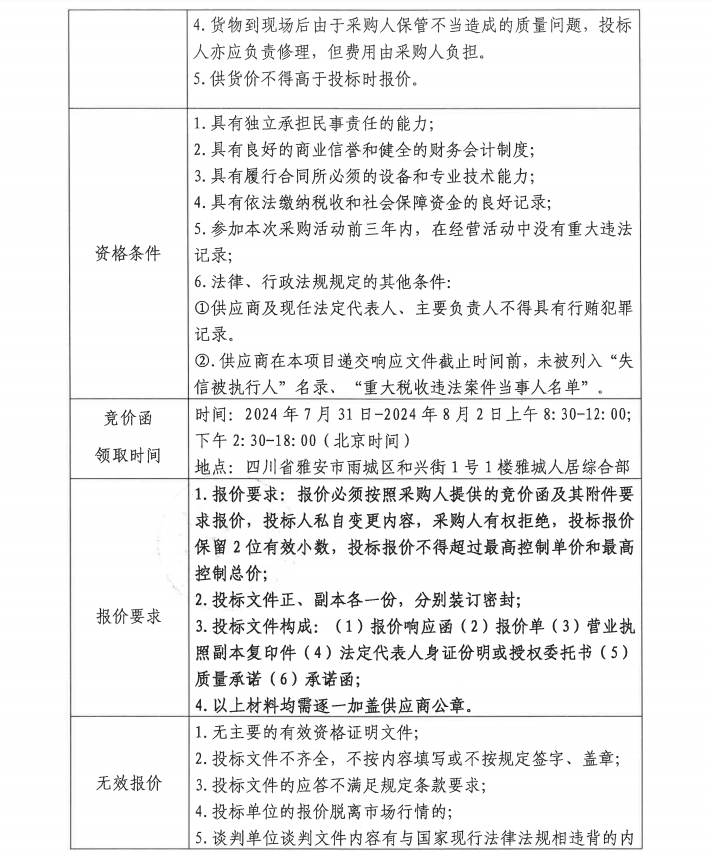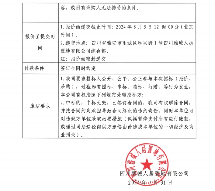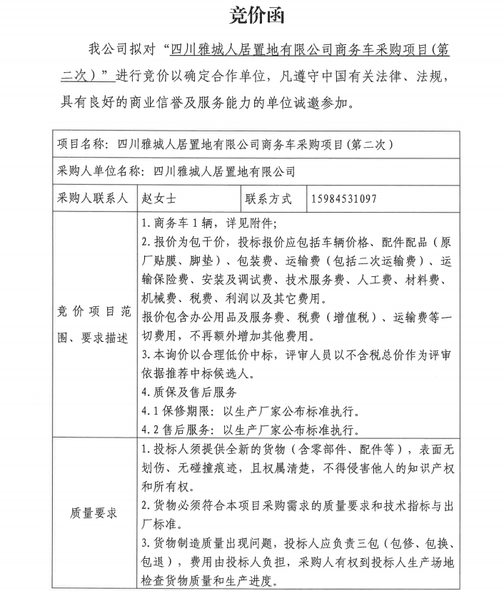 四川雅城人居置地有限公司商務車采購項目(第二次)競價公告