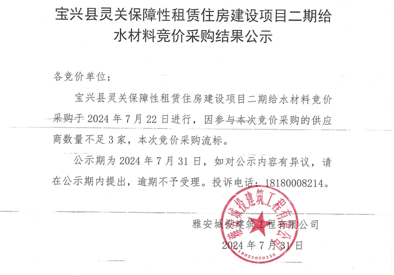 寶興縣靈關(guān)保障性租賃住房建設(shè)二期給水材料競價采購結(jié)果公示