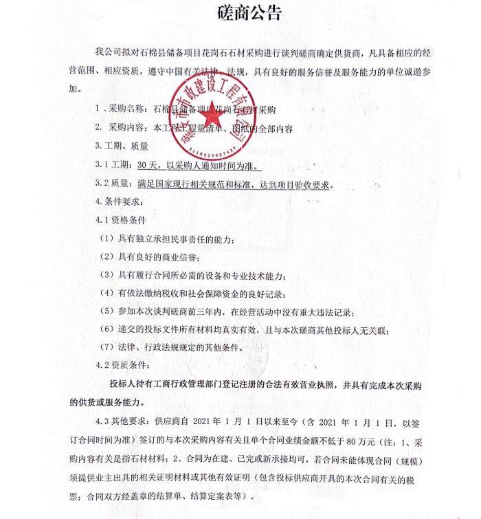 石棉縣儲(chǔ)備項(xiàng)目花崗石石材采購磋商公告