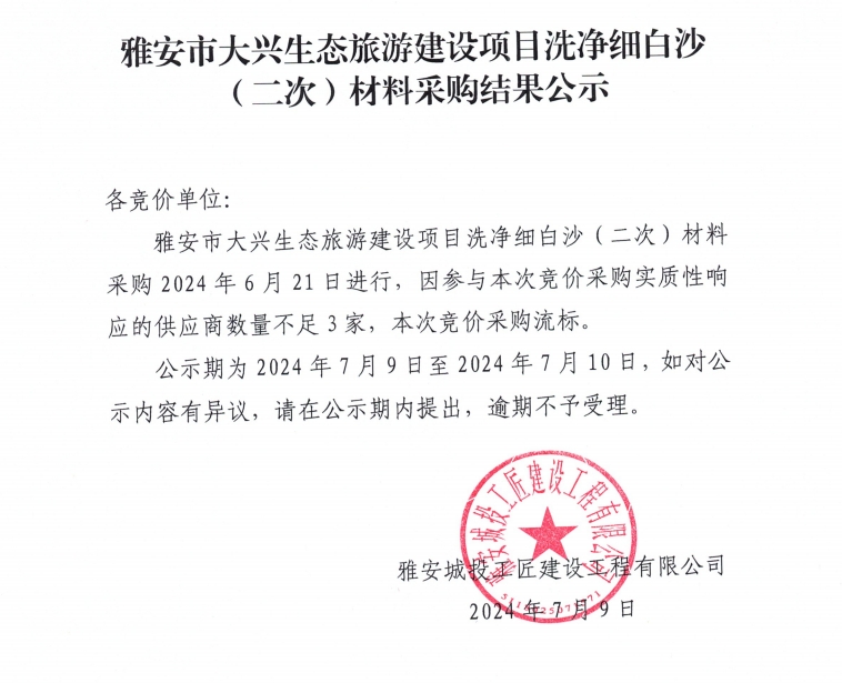 雅安市大興生態(tài)旅游建設(shè)項目洗凈細(xì)白沙(二次)材料采購結(jié)果公示