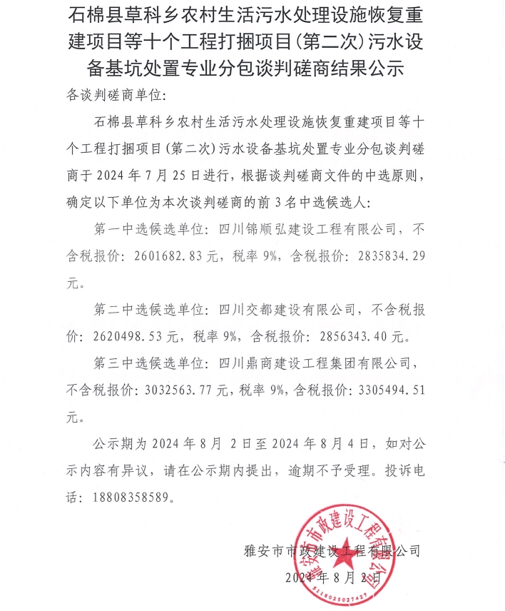 石棉縣草科鄉(xiāng)農(nóng)村生活污水處理設(shè)施恢復(fù)重建項目等十個工程打捆項目(第二次) 污水設(shè)備基坑處置專業(yè)分包談判磋商結(jié)果公示