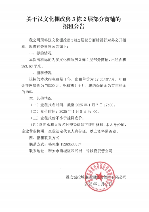 關于漢文化棚改房3棟2層部分商鋪的招租公告