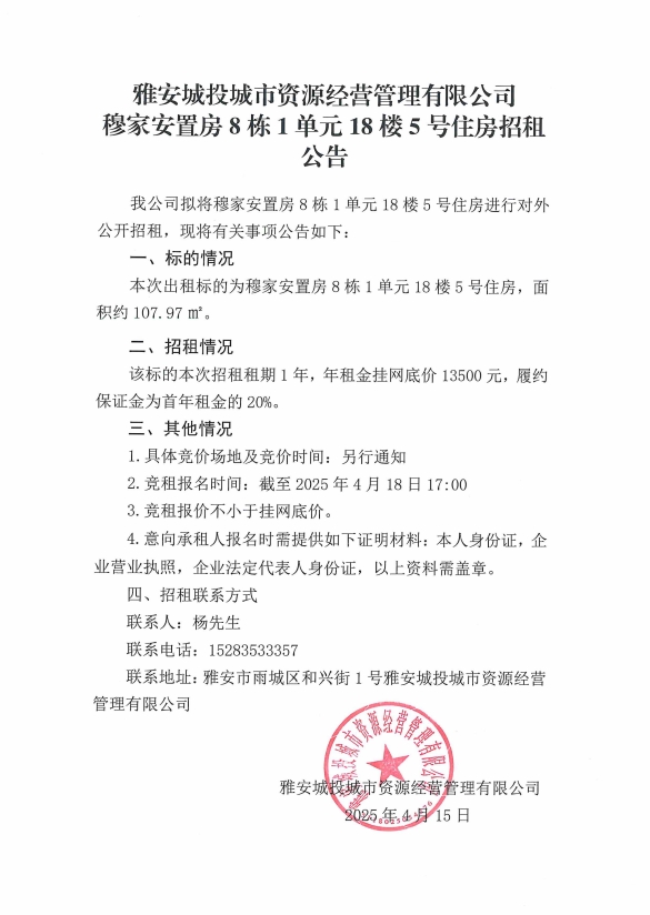 雅安城投城市資源經(jīng)營(yíng)管理有限公司穆家安置房8棟1單元18樓5號(hào)住房招租公告