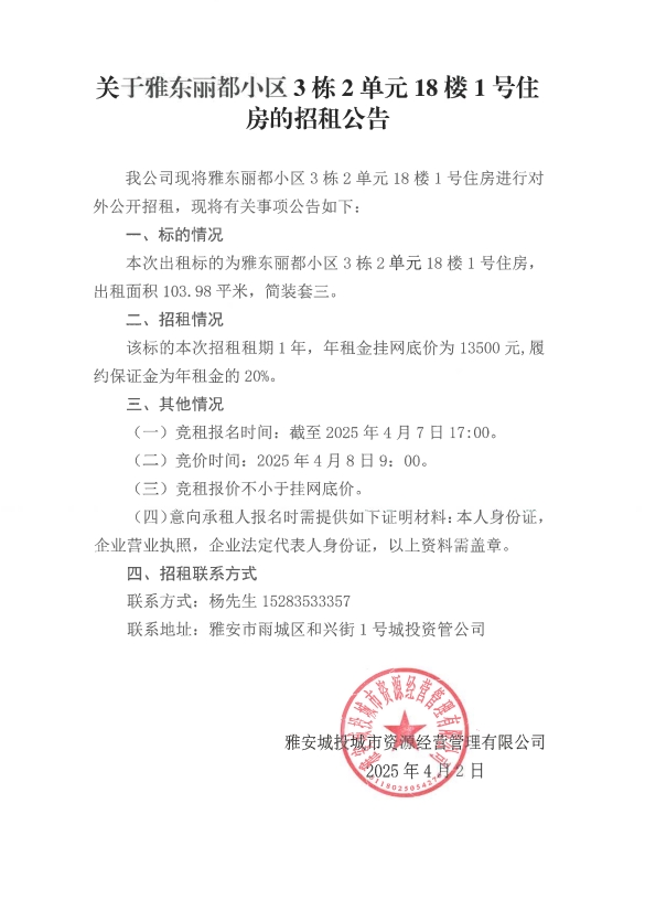 關(guān)于雅東麗都小區(qū)3棟2單元18樓1號(hào)住房的招租公告