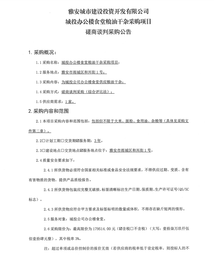 城投辦公樓食堂糧油干雜采購項(xiàng)目磋商談判采購公告