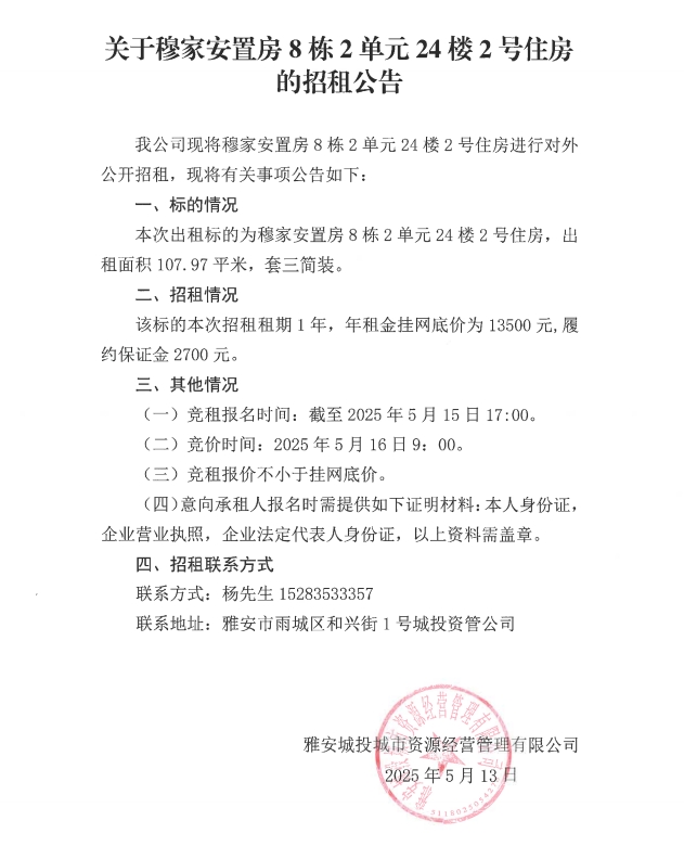 關(guān)于穆家安置房8棟2單元24樓2號(hào)住房的招租公告